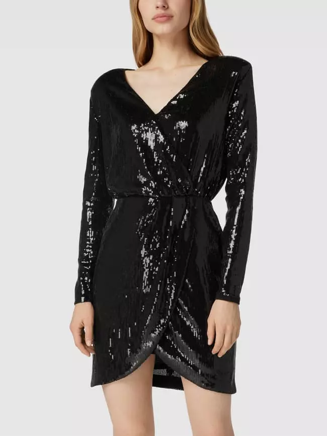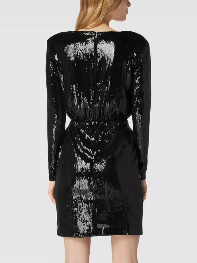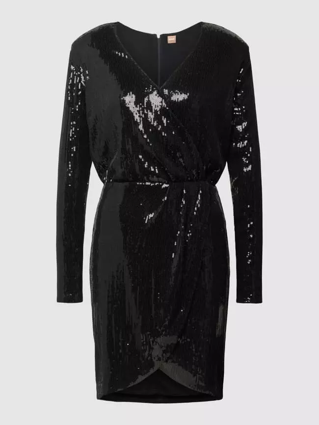 Das Kleid von BOSS ist aus einem Material-Mix mit Elasthan-Anteil gefertigt und gerade geschnitten. Es zeigt sich in Knielänge, mit Paillettenbesatz und V-Ausschnitt.