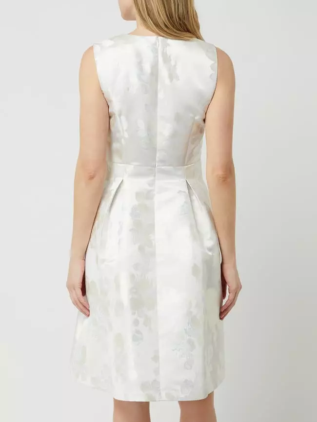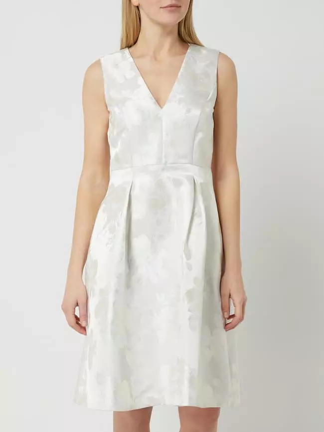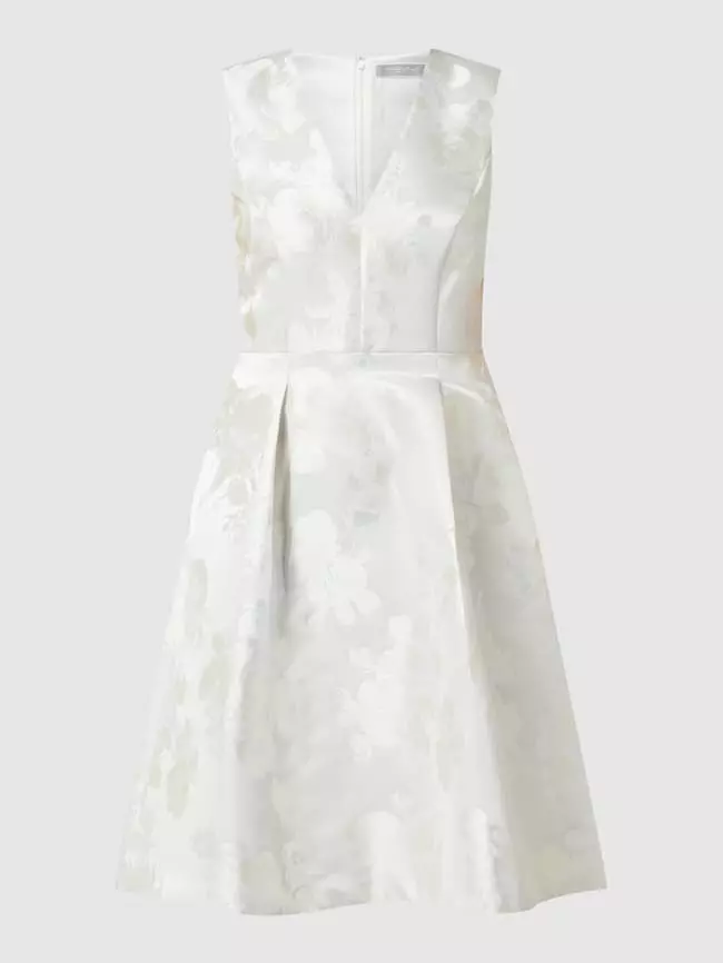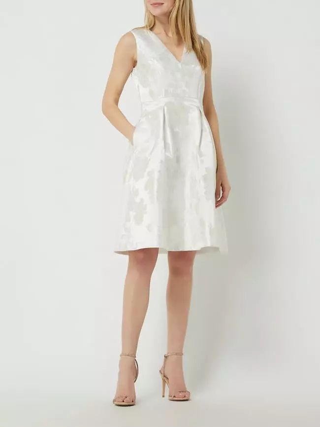 Das Brautkleid von Christian Berg Cocktail ist aus einer Materialmischung mit Effektgarn gefertigt. Es kommt in taillierter Passform mit strukturiertem Muster, V-Ausschnitt und ausgestelltem Rockteil.