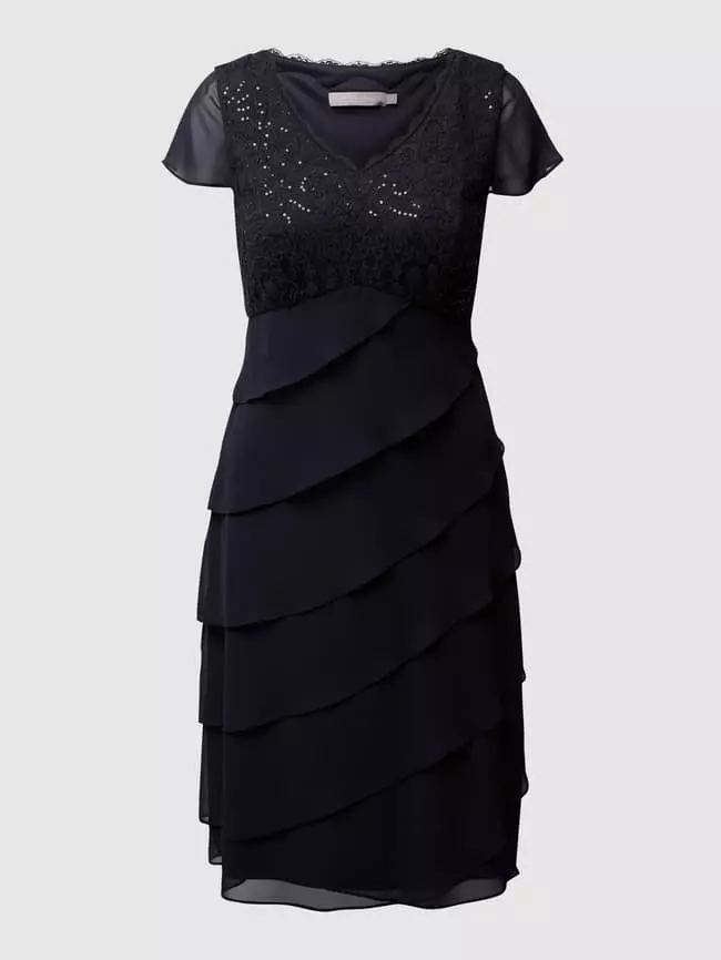Das Cocktailkleid von Christian Berg Cocktail ist aus floraler Spitze und Chiffon gefertigt. Es zeigt sich in eng anliegender Passform mit V-Ausschnitt, Pailletten-Applikationen und Rockteil im Stufen-Look.