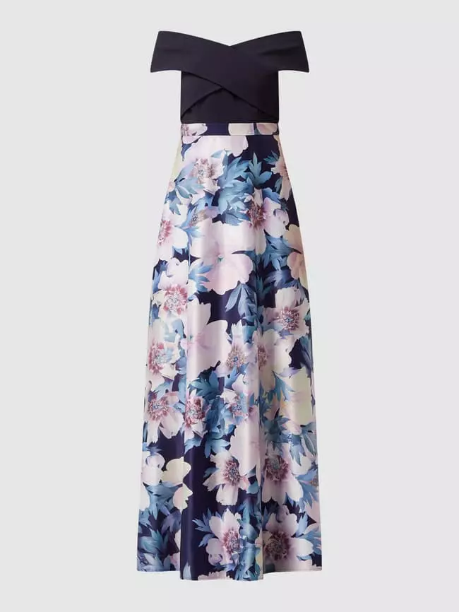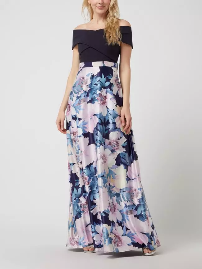 Das Off-Shoulder-Abendkleid von Christian Berg Cocktail ist aus einer Viskosemischung mit Stretch-Anteil gefertigt und tailliert geschnitten. Es zeigt sich in Wickel-Optik mit fixiertem Umschlag, gemustertem Rockteil aus Taft und Nahtreißverschluss.