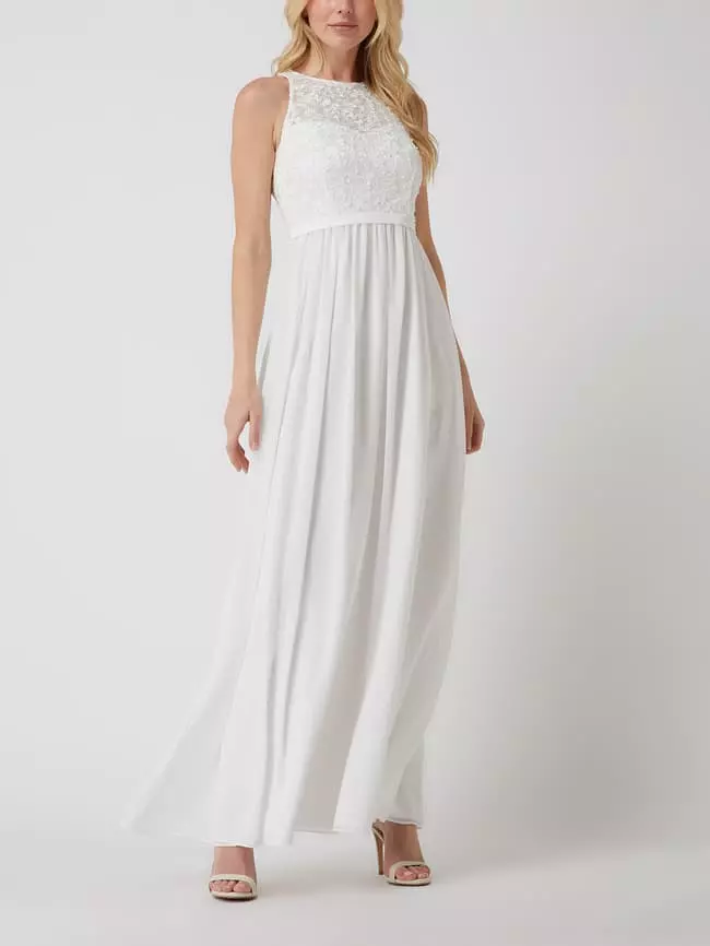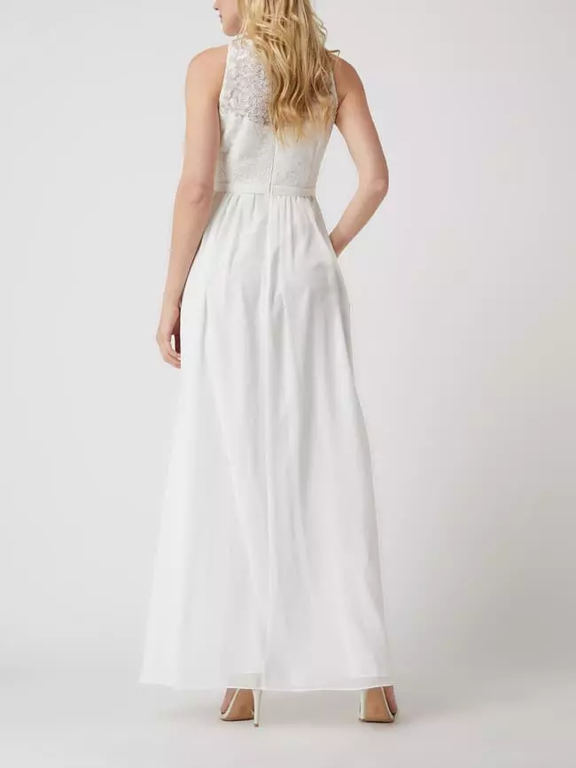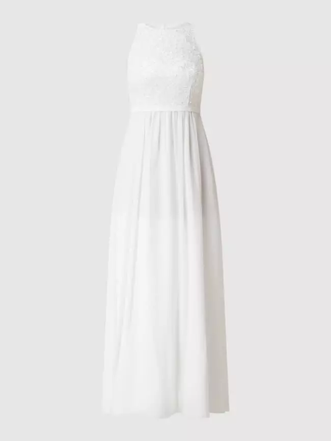Das Brautkleid von Jake*s Cocktail ist aus Spitze und Chiffon gefertigt. Es zeigt sich in taillierter Passform mit Pailletten, Zierperlen und Nahtreißverschluss auf der Rückseite.