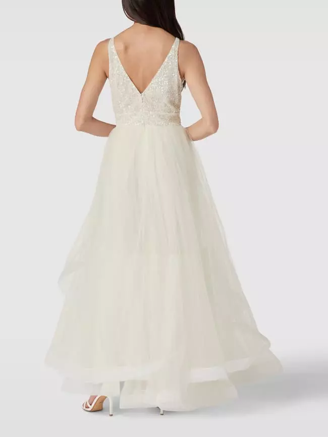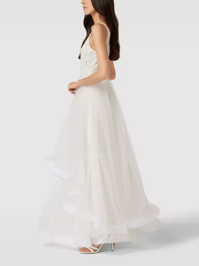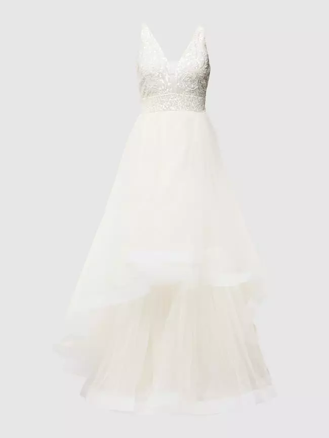 Das Brautkleid von Lace & Beads ist aus strapazierfähigem Material gefertigt und tailliert geschnitten. Es kommt mit Paillettenbesatz, Herz-Ausschnitt und ausgestellter Rockpartie sowie Vokuhila-Optik.