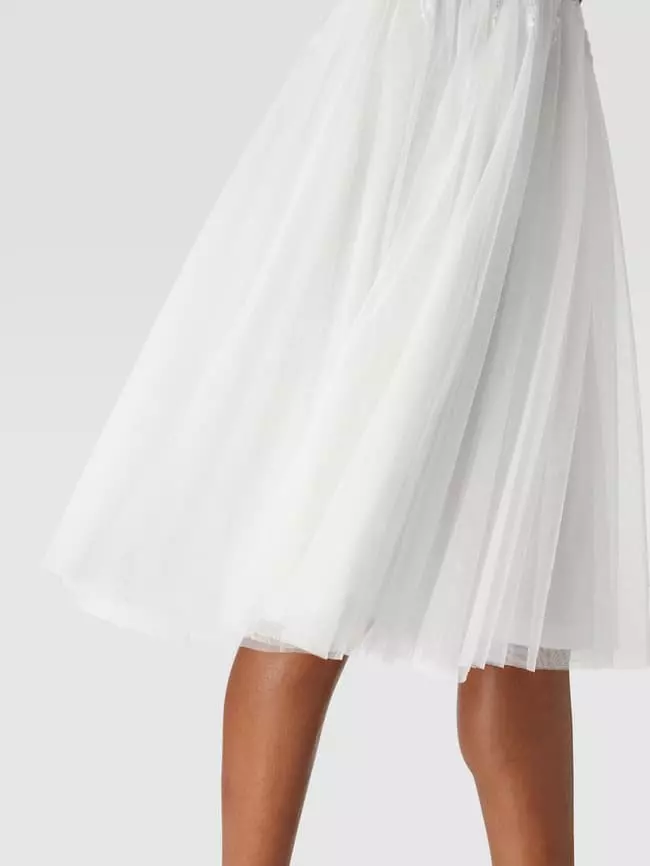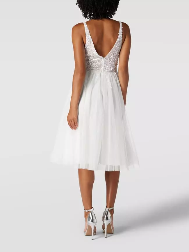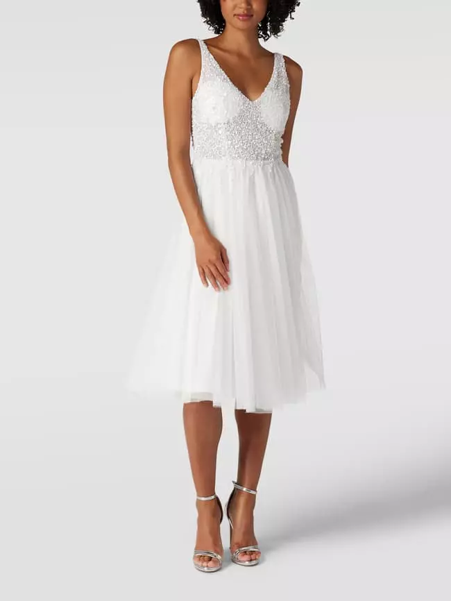 Das Brautkleid von Lace & Beads ist aus strapazierfähigem Material gefertigt und tailliert geschnitten. Es kommt mit breiten Trägern, Paillettenbesatz, V-Ausschnitt und Layer-Optik.