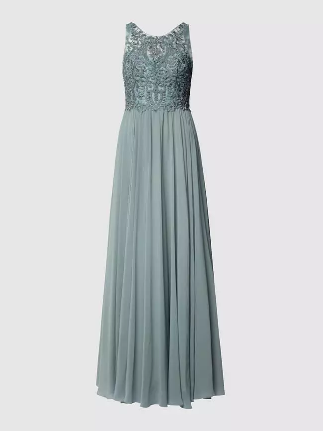 Das Abendkleid von LAONA ist aus Tüll gefertigt und tailliert geschnitten. Es kommt mit Strasssteinen, floraler Spitze, Nahtreißverschluss am Rücken und Rundhalsausschnitt.
