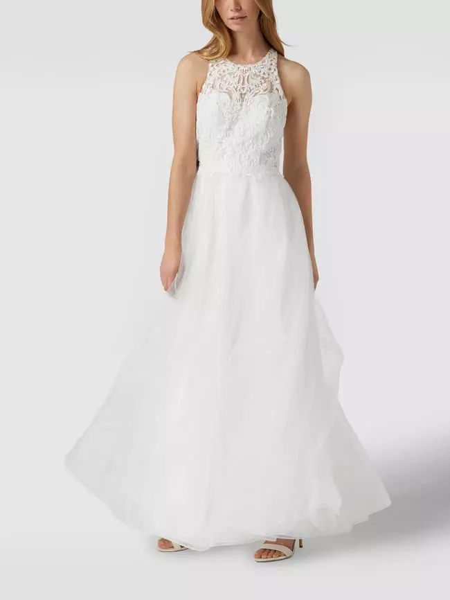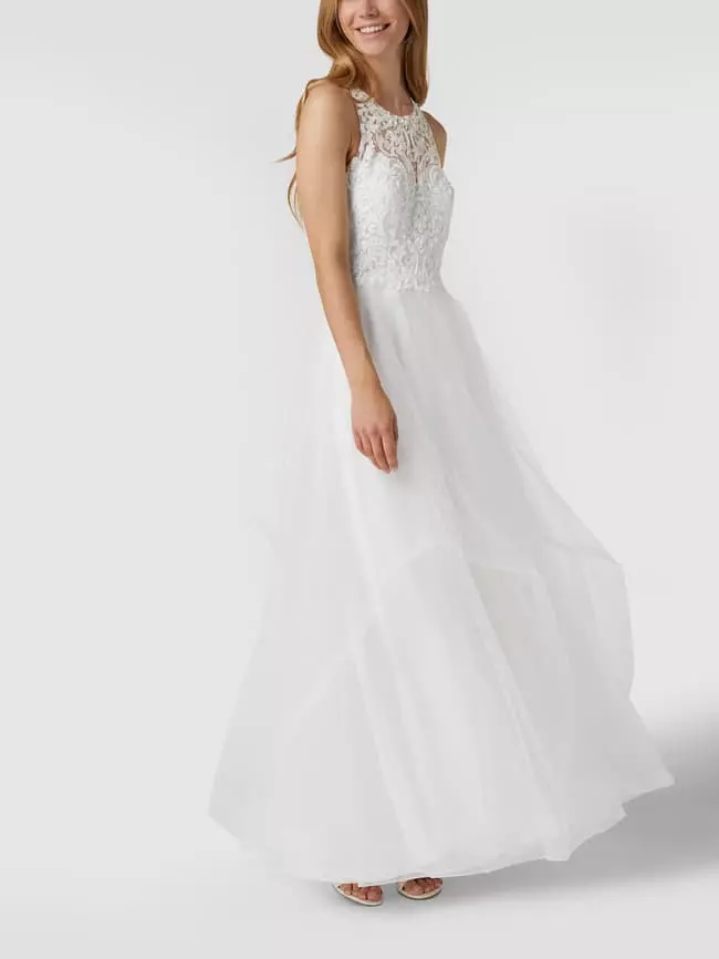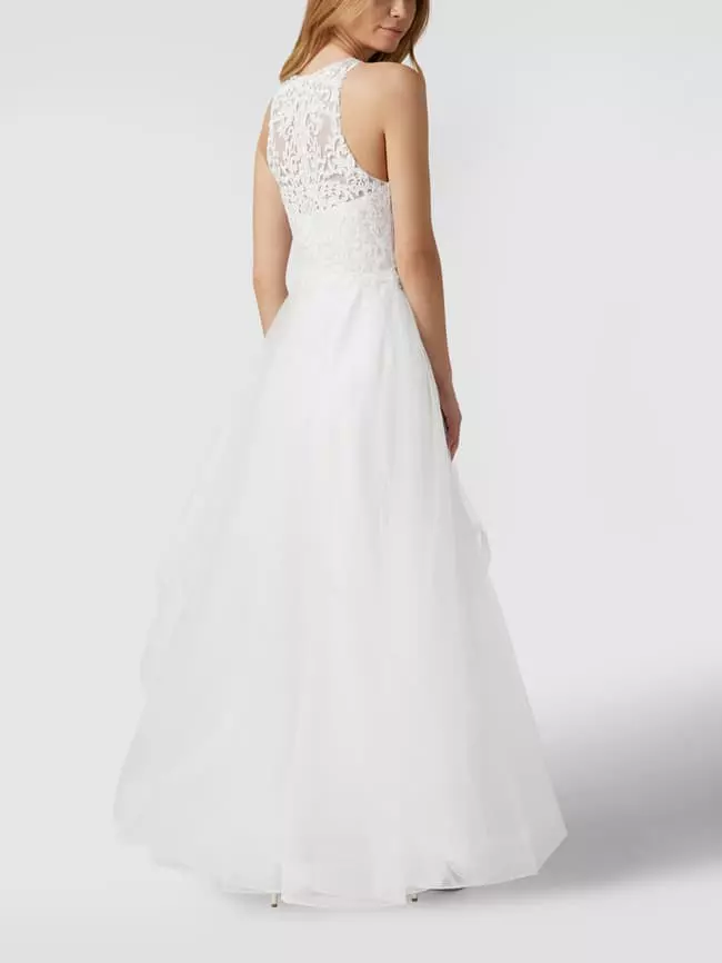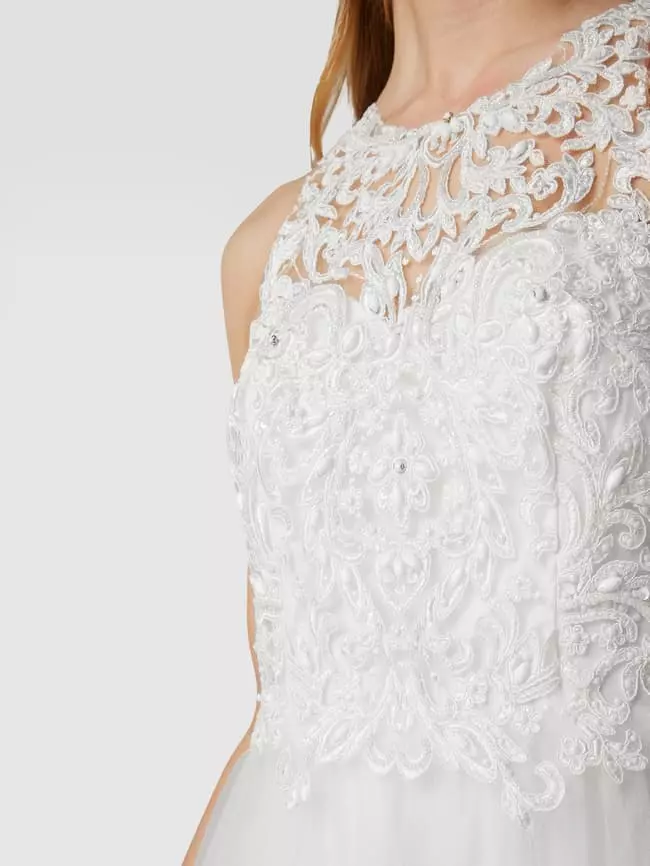 Das Brautkleid von LAONA ist aus Tüll gefertigt und tailliert geschnitten. Es zeigt sich mit floraler Spitze, Strasssteinen, Rundhalsausschnitt, Nahtreißverschluss am Rücken und weit ausgestelltem Rockteil. Das Brautkleid ist besonders detailverliebt und glamourös.