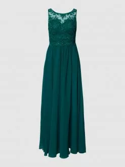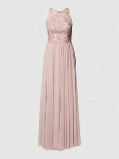Das Cocktailkleid von LAONA ist aus Tüll gefertigt und tailliert geschnitten. Es zeigt sich mit floraler Spitze, Strasssteinen, Nahtreißverschluss am Rücken, wattierten Cups und Rundhalsausschnitt.