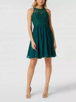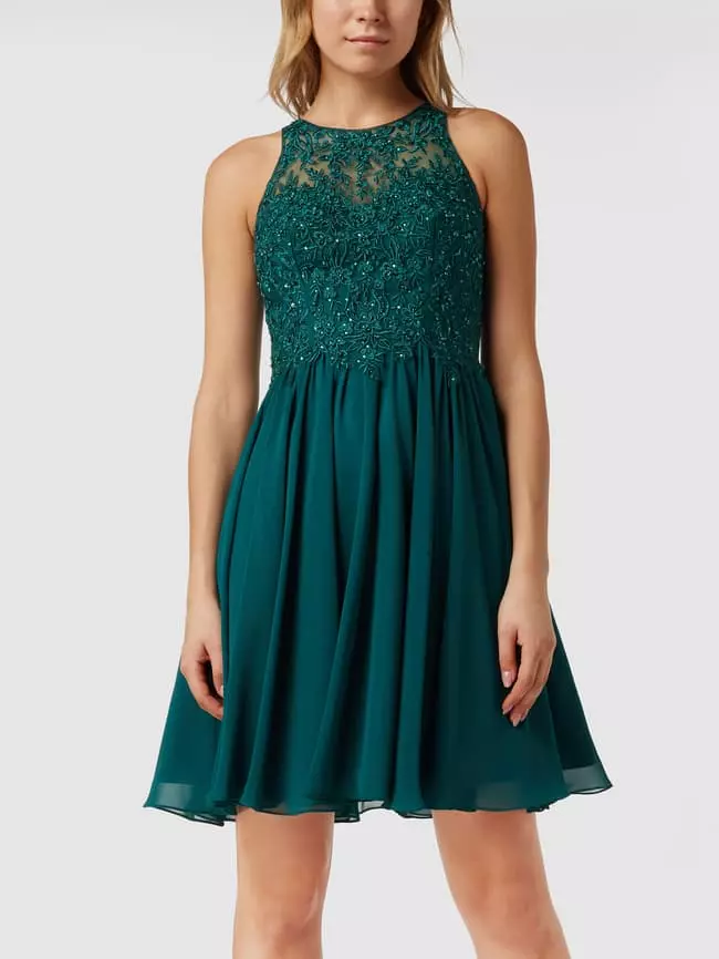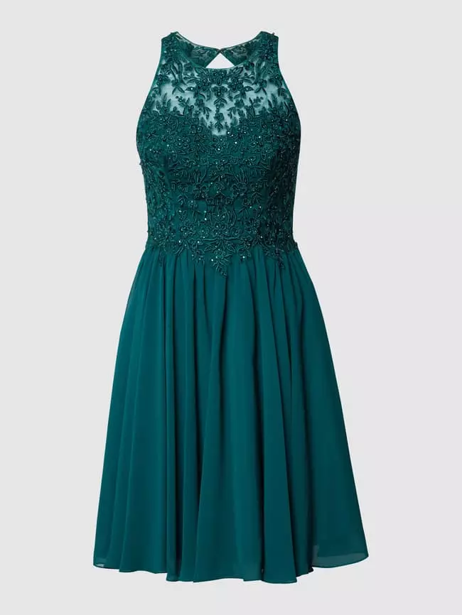 Das Cocktailkleid von LAONA ist aus strapazierfähigem Material gefertigt und tailliert geschnitten. Es zeigt sich mit floralen Stickereien, Besatz aus Ziersteinen, Cut Out am Rücken sowie doppellagigem Rockteil.
