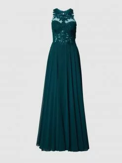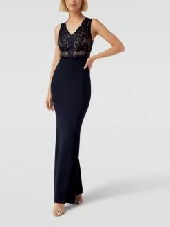 Das Abendkleid von Lipsy ist aus einem elastischen Material-Mix gefertigt und körpernah geschnitten. Es zeigt sich mit V-Ausschnitt, Schleifen-Details und floraler Spitze.