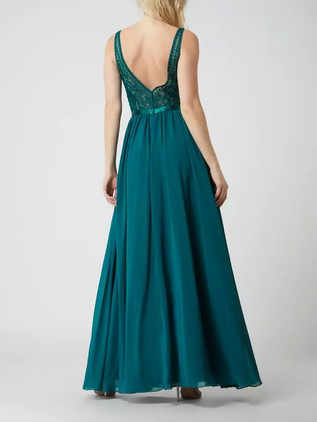 Das Abendkleid von LUXUAR MAGIC NIGHTS ist aus Tüll und Chiffon gefertigt. Es zeigt sich in taillierter Passform mit floralen Stickereien, Strasssteinen und tiefem Rückenausschnitt.