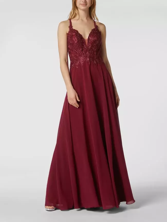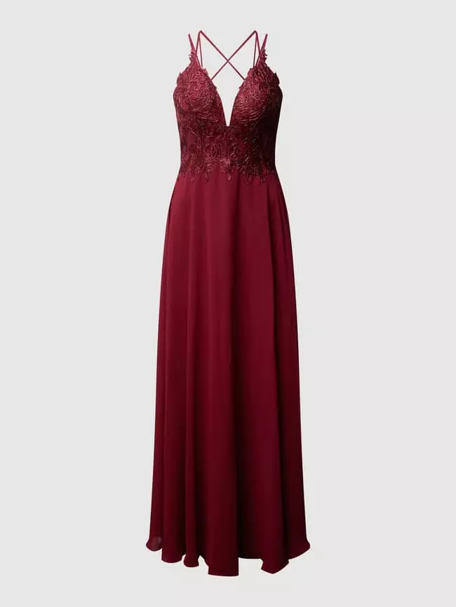 Das Abendkleid von LUXUAR LIMITED ist aus Mesh und Chiffon gefertigt. Es zeigt sich in taillierter Passform mit gekreuzten Spaghettiträgern, Strasssteinen und tiefem Rückenausschnitt.