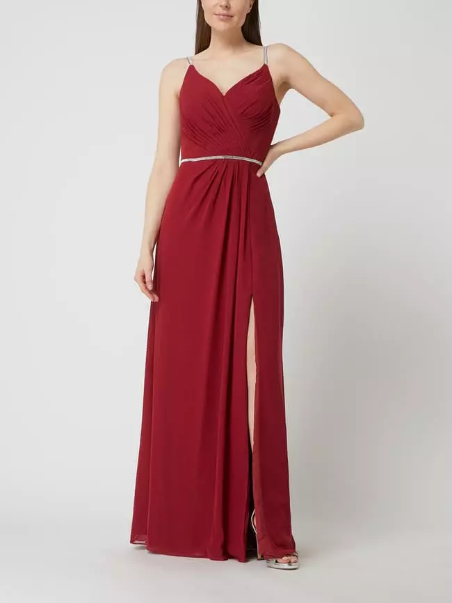 Das Abendkleid von LUXUAR FASHION ist aus strapazierfähigem Material gefertigt und tailliert geschnitten. Es kommt mit Spaghettiträgern, Raffungen und Herzausschnitt sowie Ziersteinen.