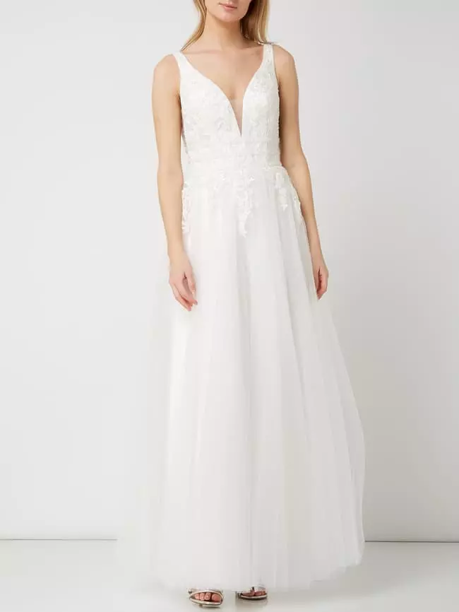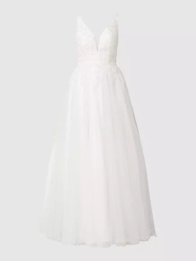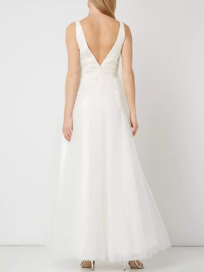 Das Brautkleid von LUXUAR MAGIC BRIDE ist aus Mesh gefertigt und tailliert geschnitten. Es kommt mit Glitter-Effekt, floralen Stickereien und mehrlagigem Rockteil.