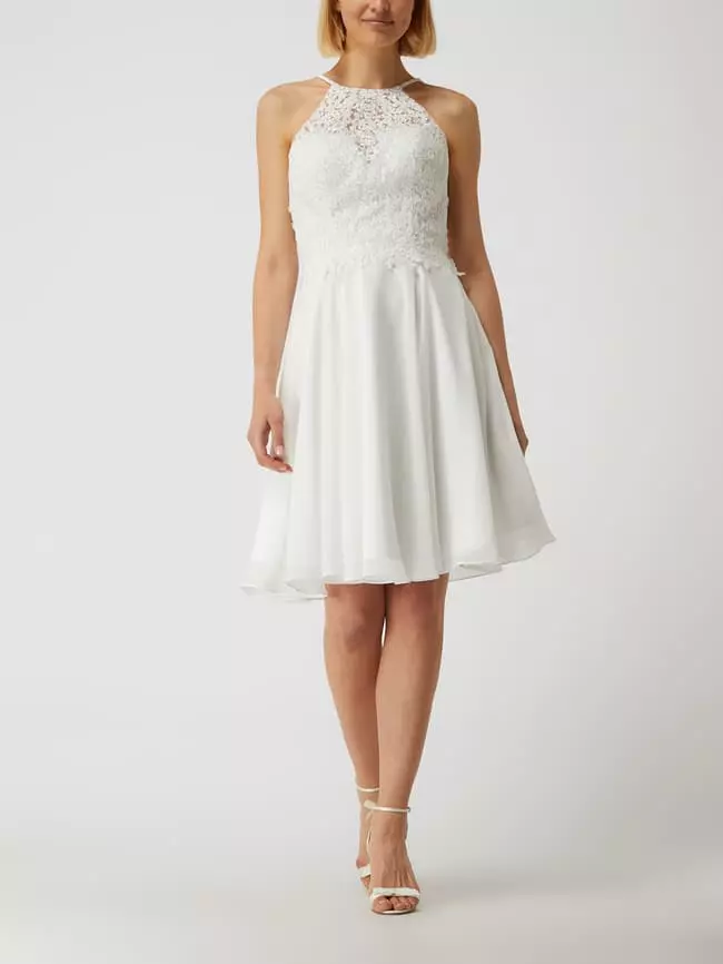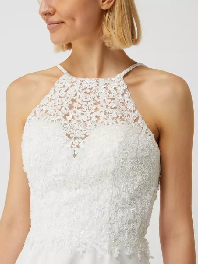 Das Brautkleid von LUXUAR MAGIC NIGHTS ist aus Spitze und Chiffon gefertigt. Es zeigt sich in taillierter Passform mit geflochtenen Trägern, ausgestelltem Rockteil und Zierriemen.