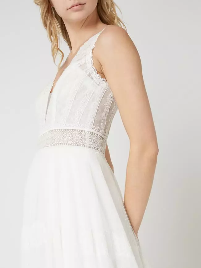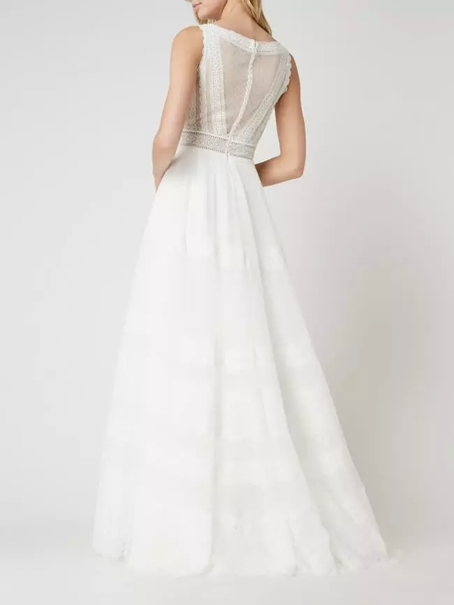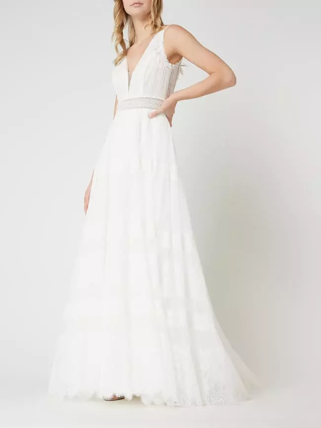 Das Brautkleid von LUXUAR MAGIC BRIDE ist aus Spitze und Tüll gefertigt. Es zeigt sich in taillierter Passform mit tiefem Ausschnitt, weit ausgestelltem Rockteil und Zierknöpfen aus Satin. Das Brautkleid eignet sich perfekt für eine Hochzeit im Boho-Stil.