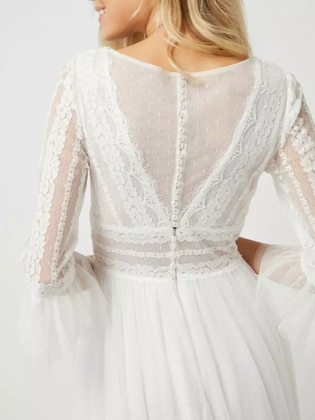 Das Brautkleid von LUXUAR ist aus Spitze und Tüll gefertigt. Es zeigt sich mit langer Schleppe, Trompetenärmeln und Zierperlen. Das Brautkleid kommt im stilvollen Boho-Stil und steht für einen leichten Look mit tollen Details.