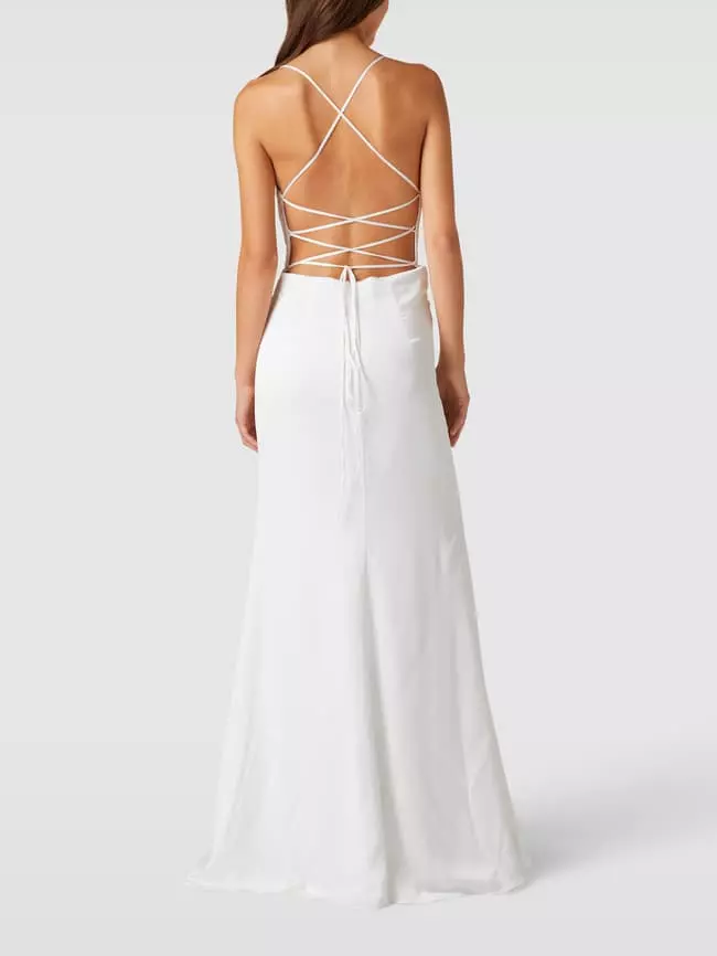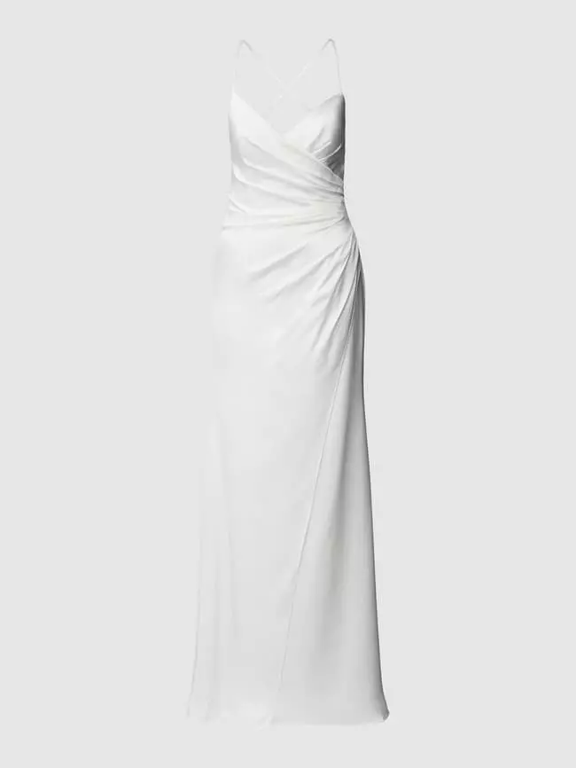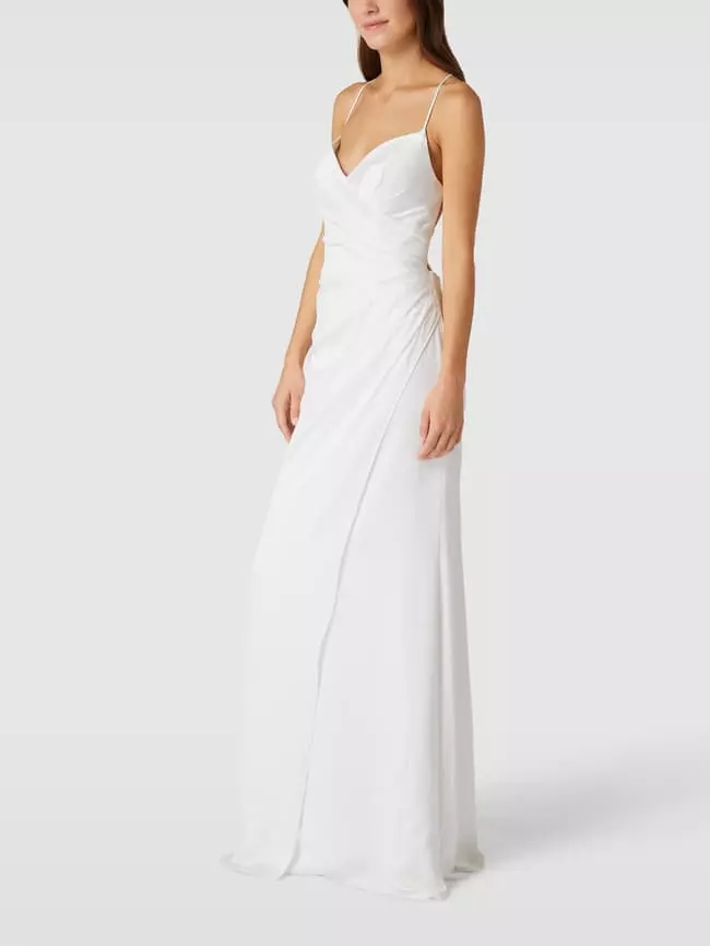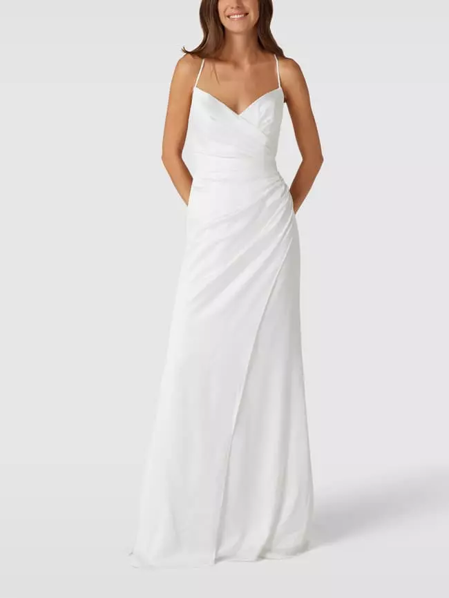 Das Brautkleid von LUXUAR FASHION ist aus einem strapazierfähigen Material gefertigt und körpernah geschnitten. Es zeigt sich in Wickel-Optik mit Spaghettiträgern.