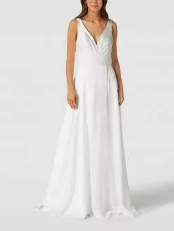 Das Brautkleid von LUXUAR FASHION ist aus einem strapazierfähigen Material gefertigt und tailliert geschnitten. Es zeigt sich in Wickel-Optik mit gelegten Falten.