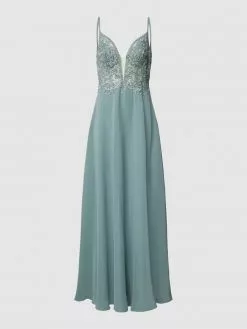 Das Brautkleid von LUXUAR ist aus Mesh und Spitze gefertigt. Es zeigt sich in taillierter Passform mit V-Ausschnitt, mehrlagigem Rockteil und Schleppe.