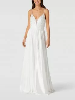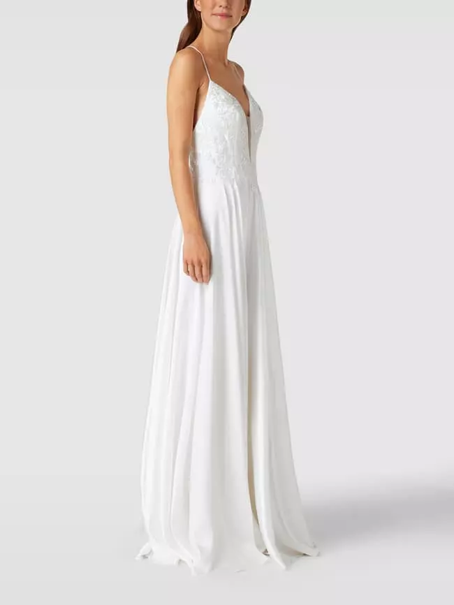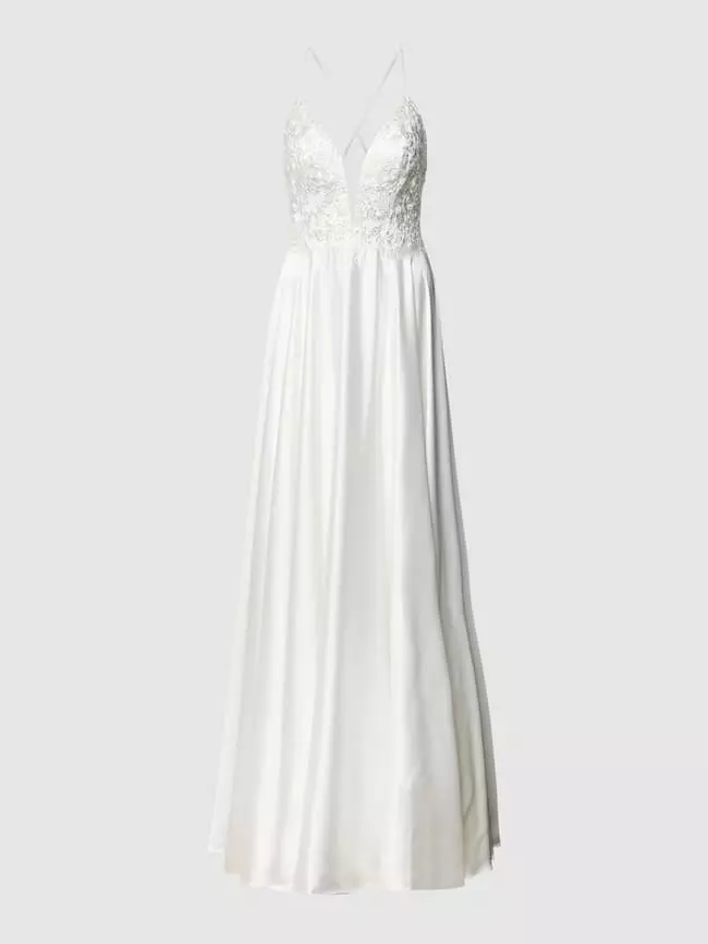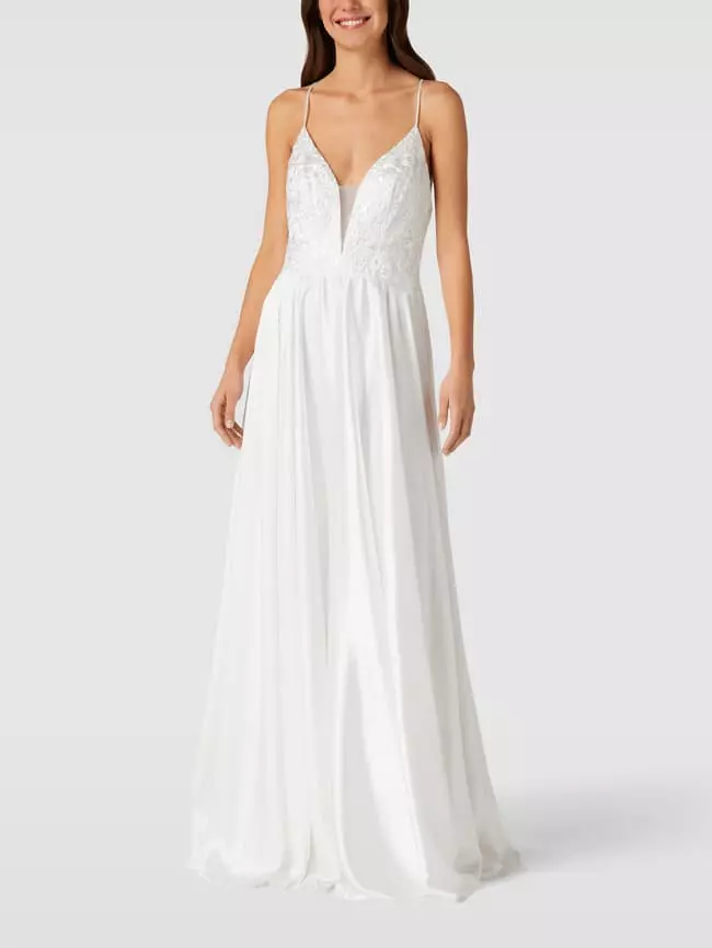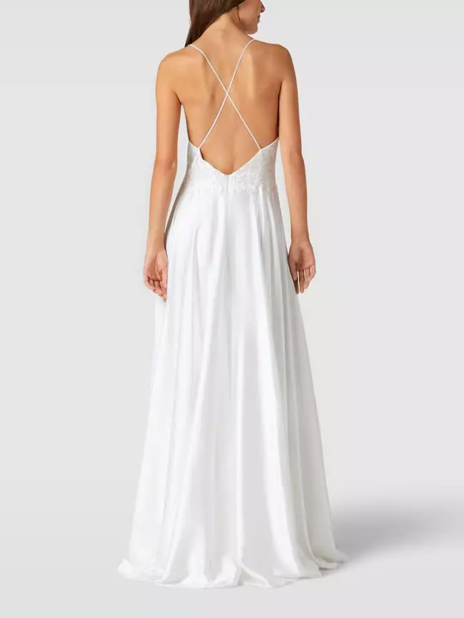 Das Brautkleid von LUXUAR FASHION ist aus strapazierfähigem Material gefertigt und tailliert geschnitten. Es zeigt sich in Glanz-Optik mit Spaghettiträgern.