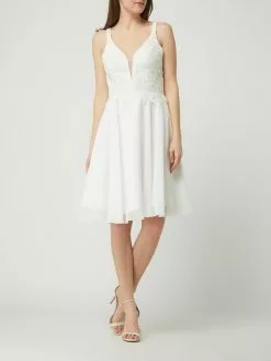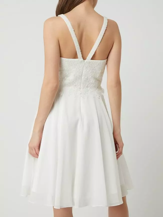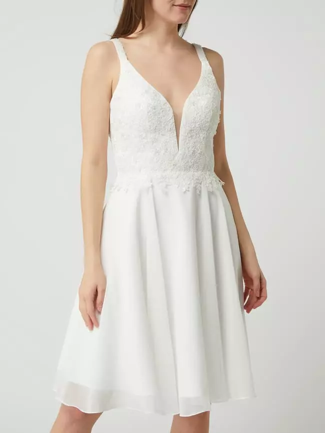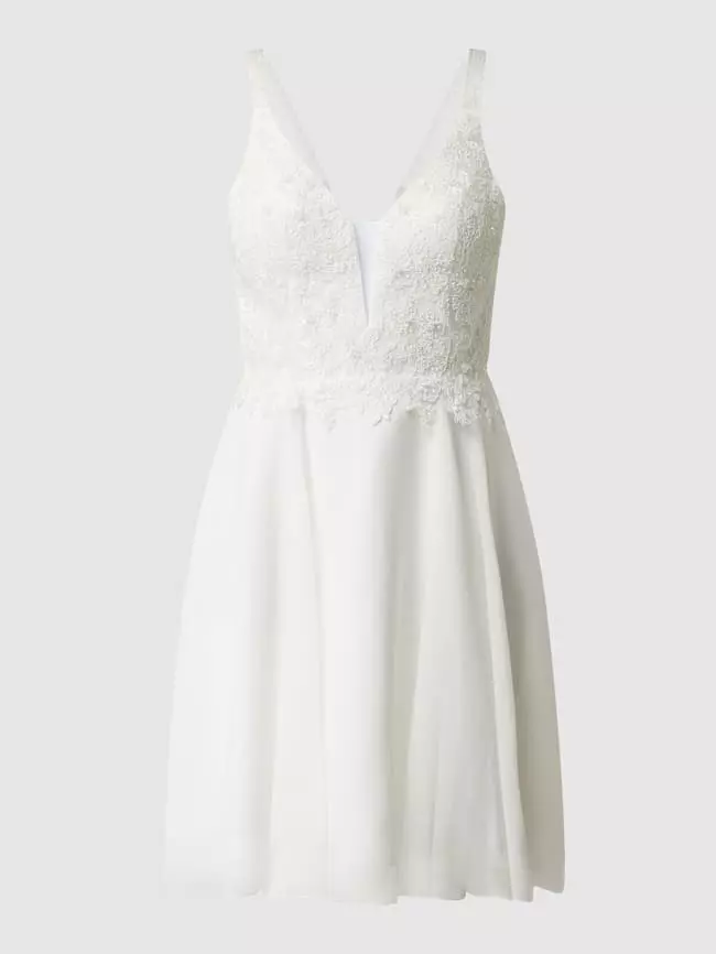 Das Brautkleid von LUXUAR LIMITED ist aus Spitze und Chiffon gefertigt. Es zeigt sich in taillierter Passform mit Zierperlen, Strasssteinen an den Trägern und Schößchen.