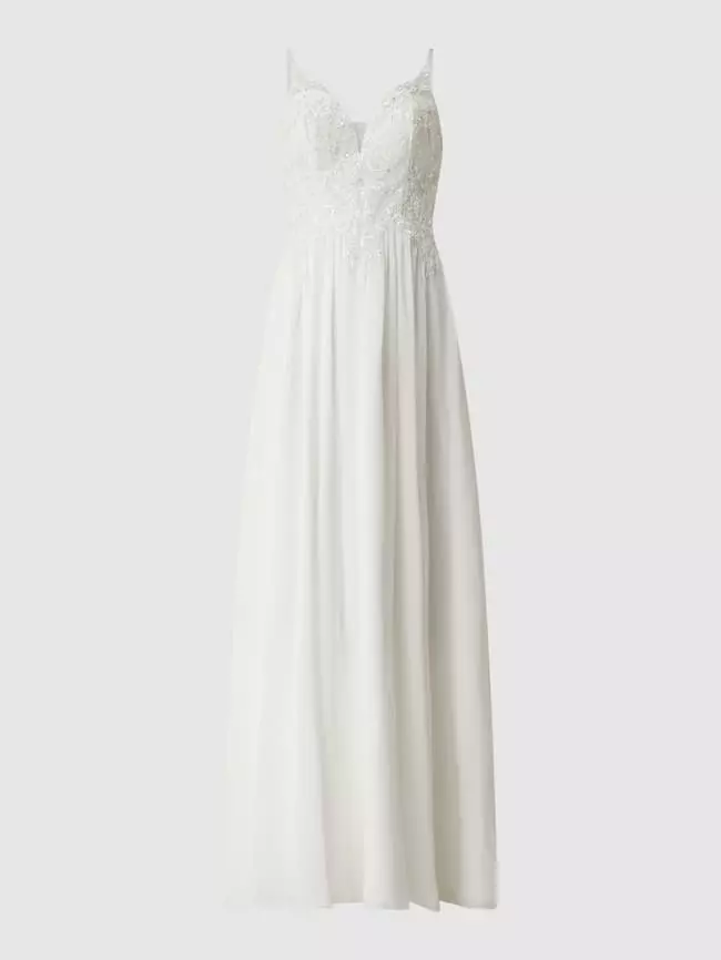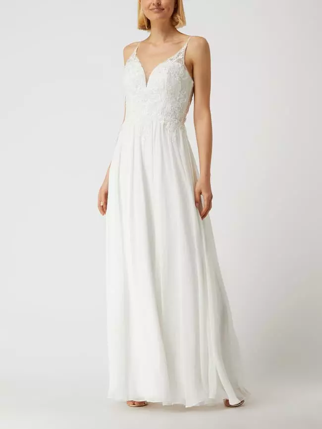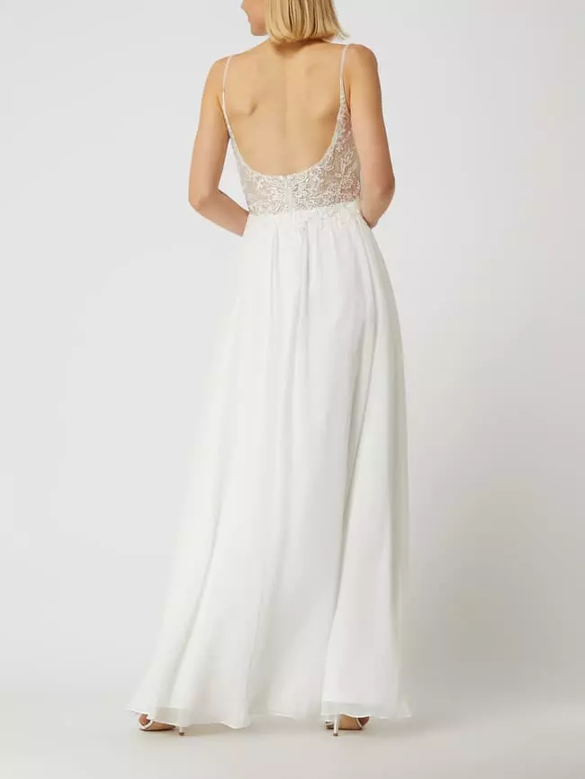 Das Brautkleid von LUXUAR MAGIC NIGHTS ist aus Spitze und Chiffon gefertigt. Es zeigt sich in taillierter Passform mit Spaghettiträgern, Strasssteinen und tiefem Rückenausschnitt.