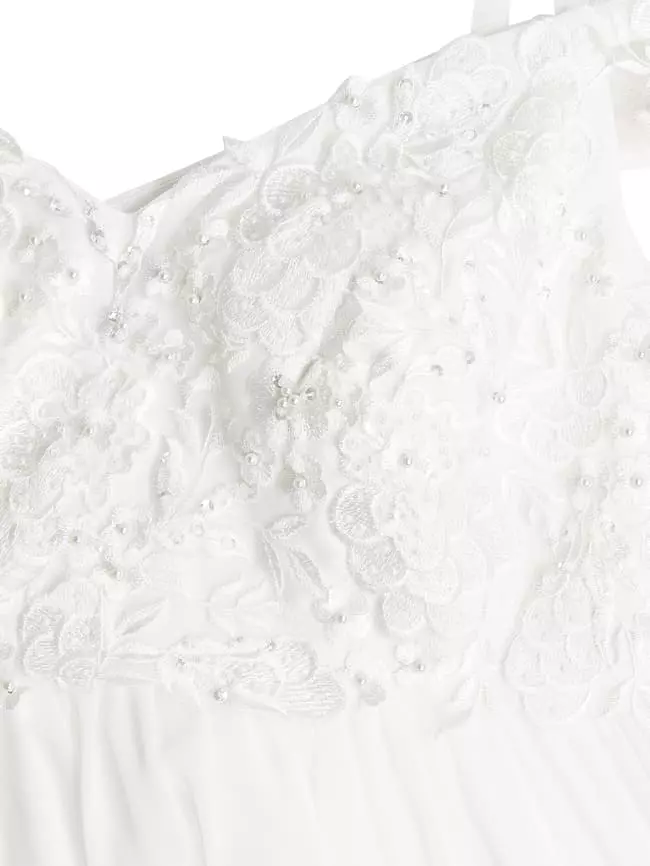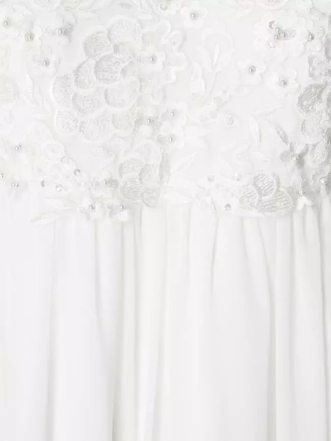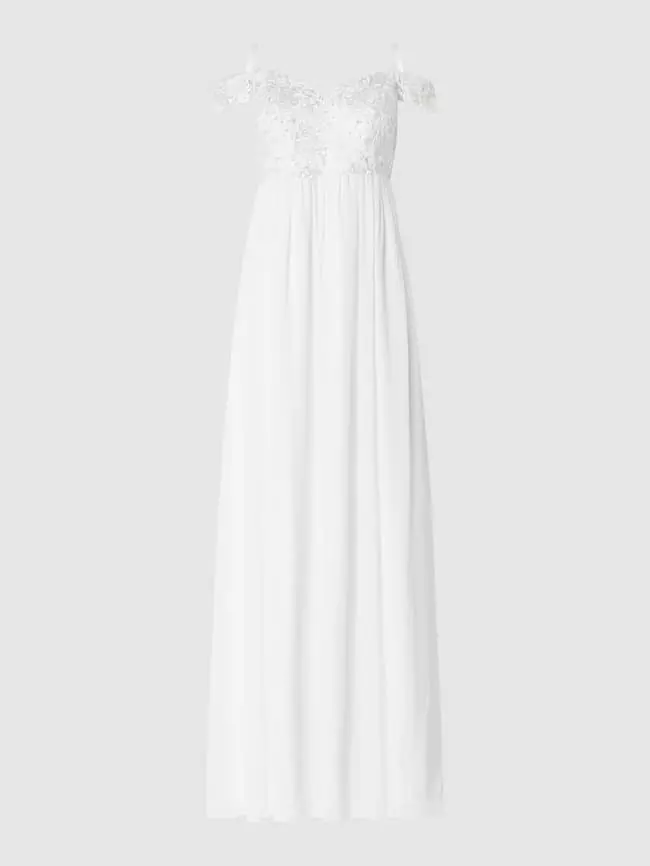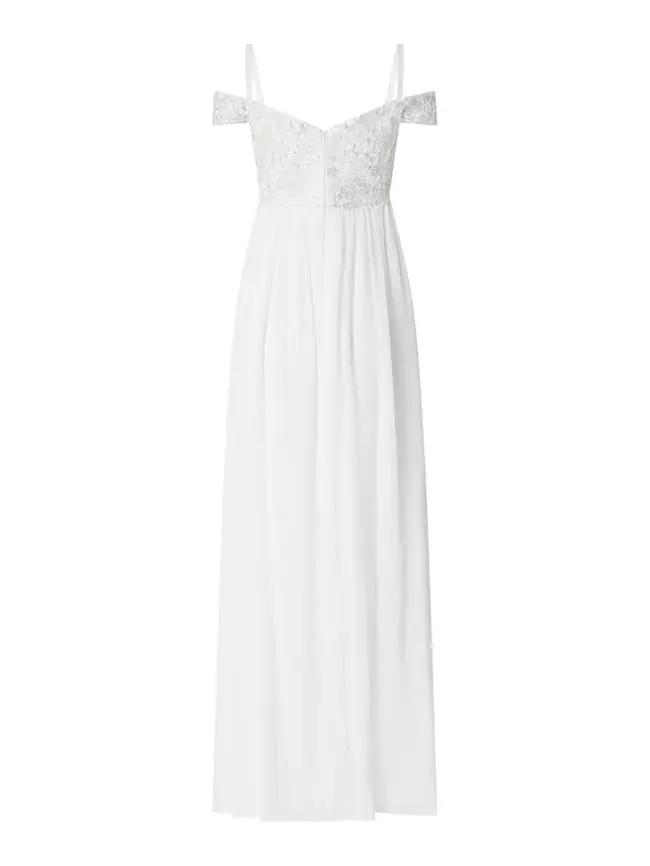 Das Umstandsbrautkleid von LUXUAR MAGIC BRIDE ist aus Spitze und Chiffon gefertigt. Es ist ausgestellt geschnitten und zeigt sich im Cold-Shoulder-Look mit elastischen Trägern und Zierperlen.