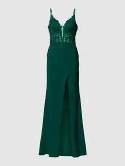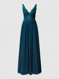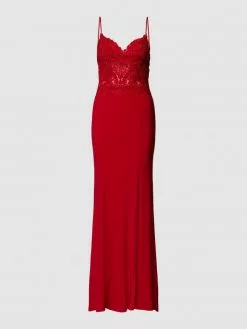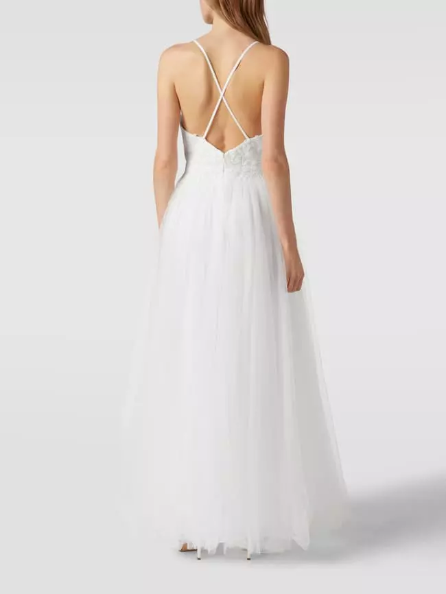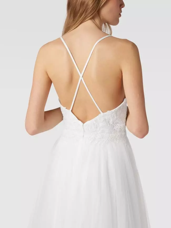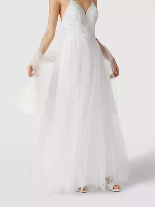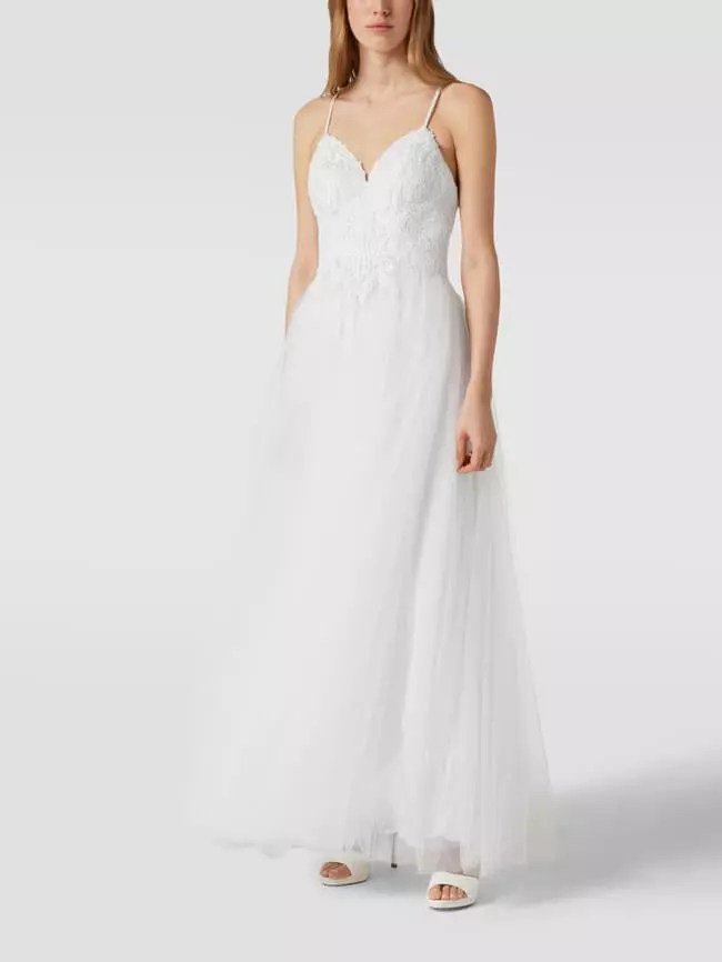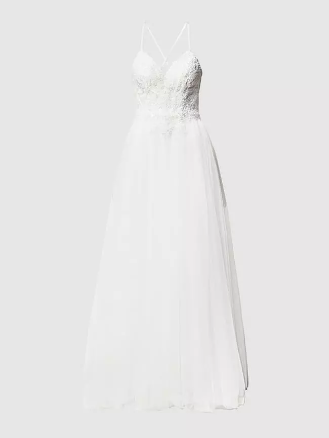 Das Brautkleid von Mascara ist aus robustem Material gefertigt und tailliert geschnitten. Es kommt mit Herz-Ausschnitt, floralen Stickereien und Spaghettiträgern sowie Haken- und Nahtreißverschluss auf der Rückseite.