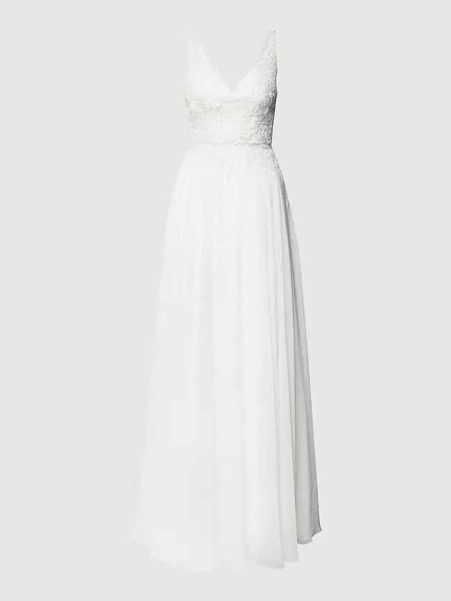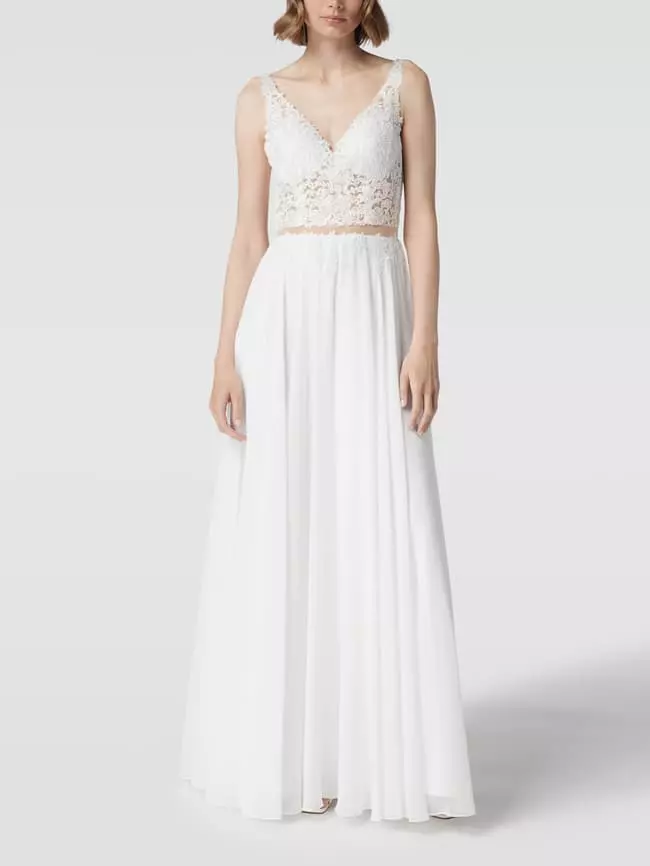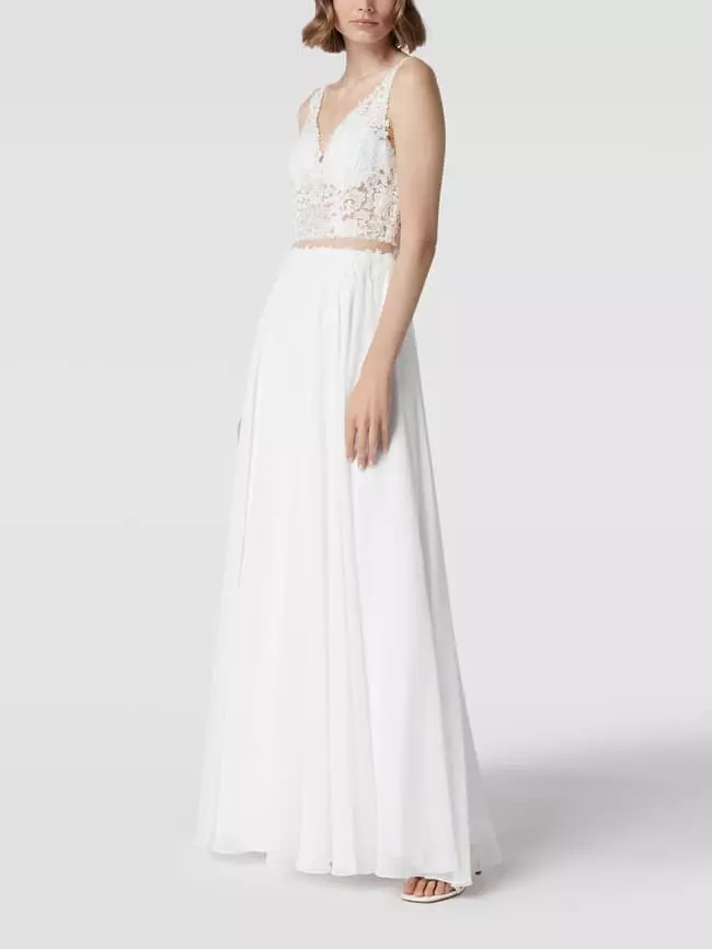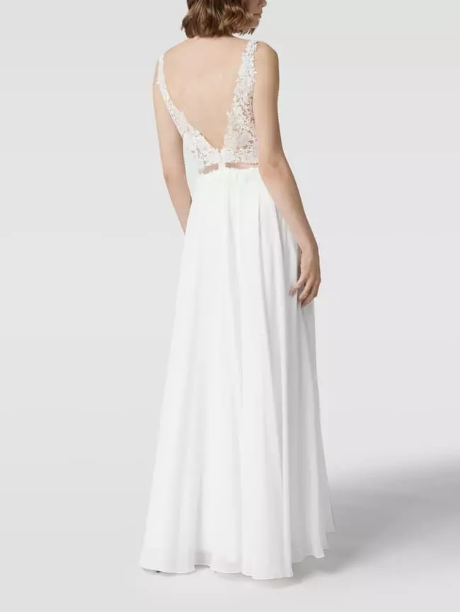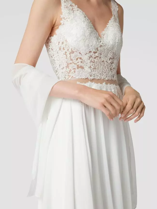 Das Brautkleid von Mascara ist aus einem strapazierfähigen Material gefertigt und tailliert geschnitten. Es zeigt sich in Midilänge mit floraler Stickerei, Ziersteinbesatz, Herz-Ausschnitt und semitransparenten Einsätzen.