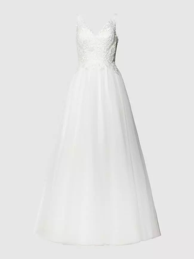 Das Brautkleid von Mascara ist aus einem strapazierfähigen Material gefertigt und im taillierten Schnitt gehalten. Es zeigt sich in unifarbenem Design mit Herz-Ausschnitt und Zierbesatz.
