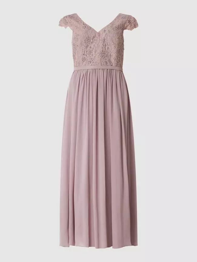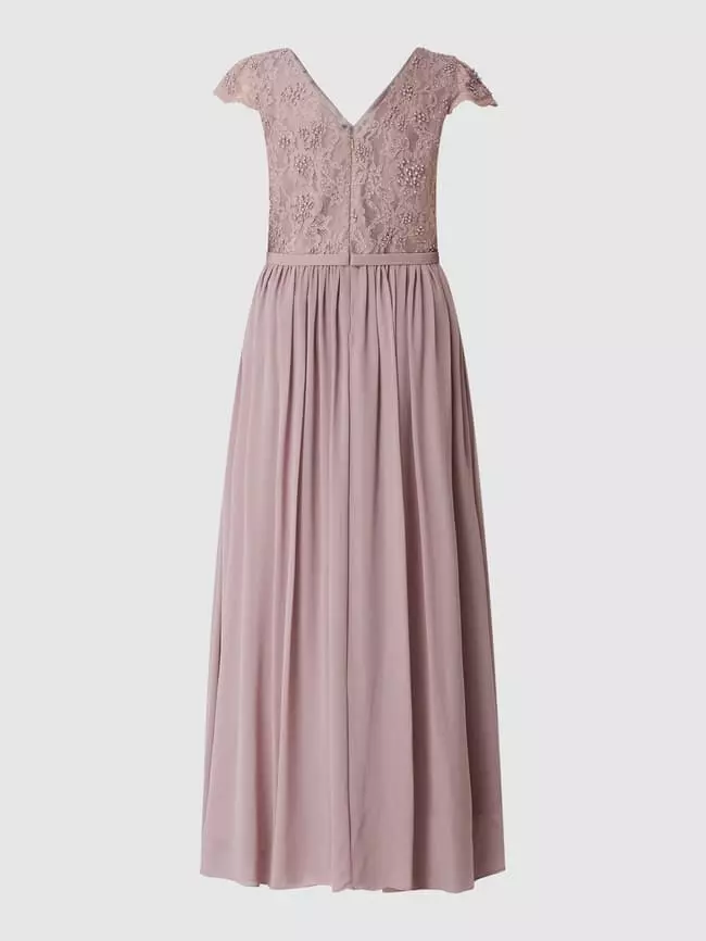 Das Abendkleid von My Mascara Curves ist aus Spitze und Chiffon gefertigt. Es zeigt sich in taillierter Passform mit V-Ausschnitt, Zierperlen und ausgestelltem Rockteil.