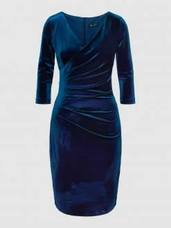 Das Cocktailkleid von Paradi ist aus einer leichten Materialmischung mit Stretch-Anteil gefertigt und eng anliegend geschnitten. Es zeigt sich mit V-Ausschnitt in Wickel-Optik, Dreiviertelärmeln und drapierten Falten.