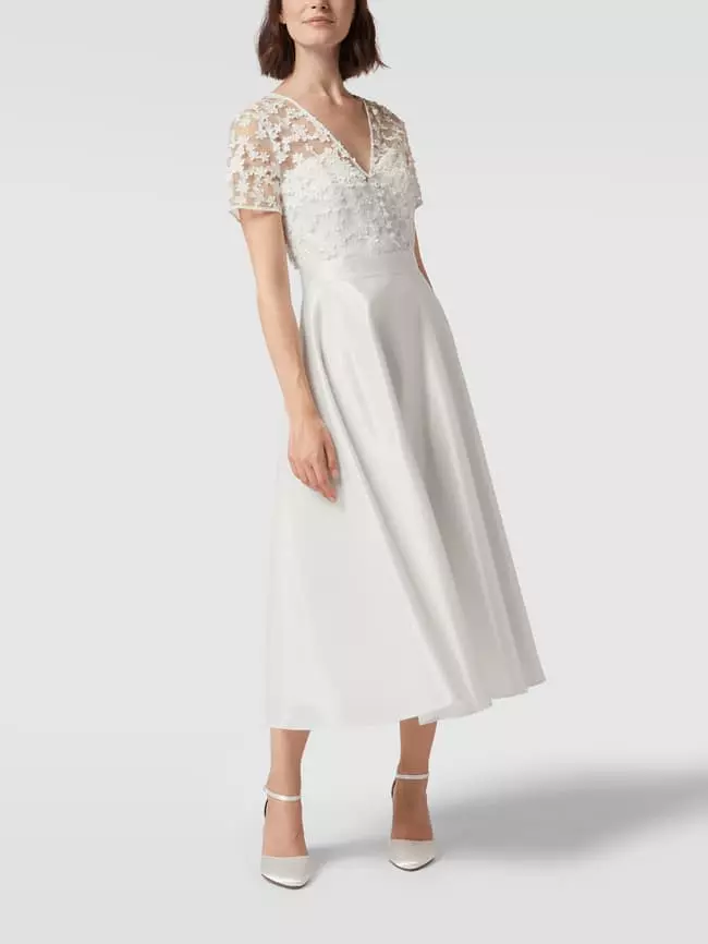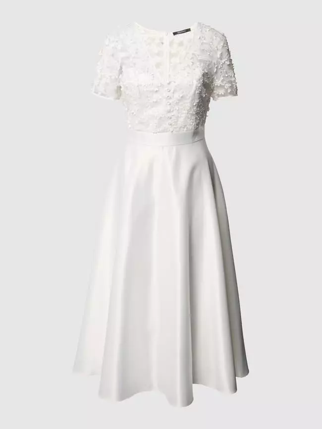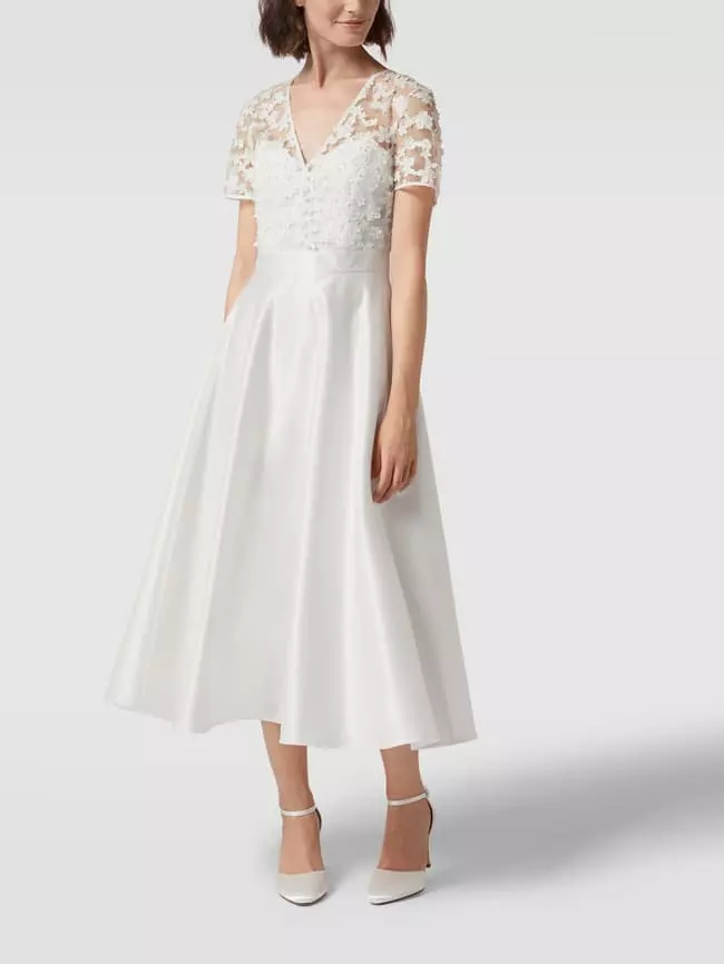Das Brautkleid von SWING ist aus strapazierfähigem Material gefertigt und tailliert geschnitten. Es kommt in Midilänge, semitransparentem Einsatz mit floralem Besatz und V-Ausschnitt.