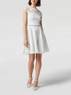 Das Brautkleid von SWING ist aus strapazierfähigem Material gefertigt und tailliert geschnitten. Es kommt mit kurzen Ärmeln, floralen Stickereien, Taillenpasse mit Ziersteinen sowie doppellagigem Rockteil.