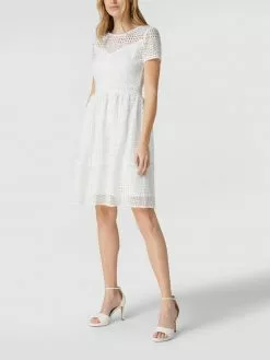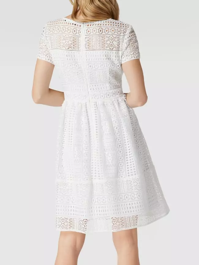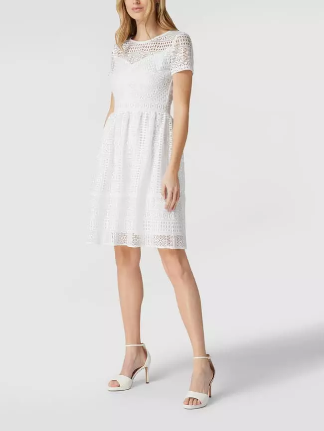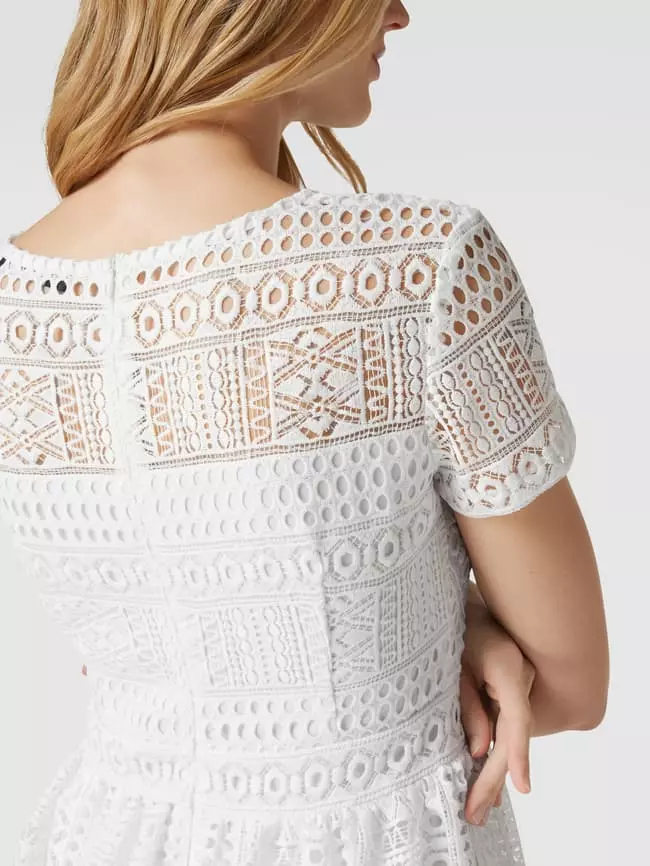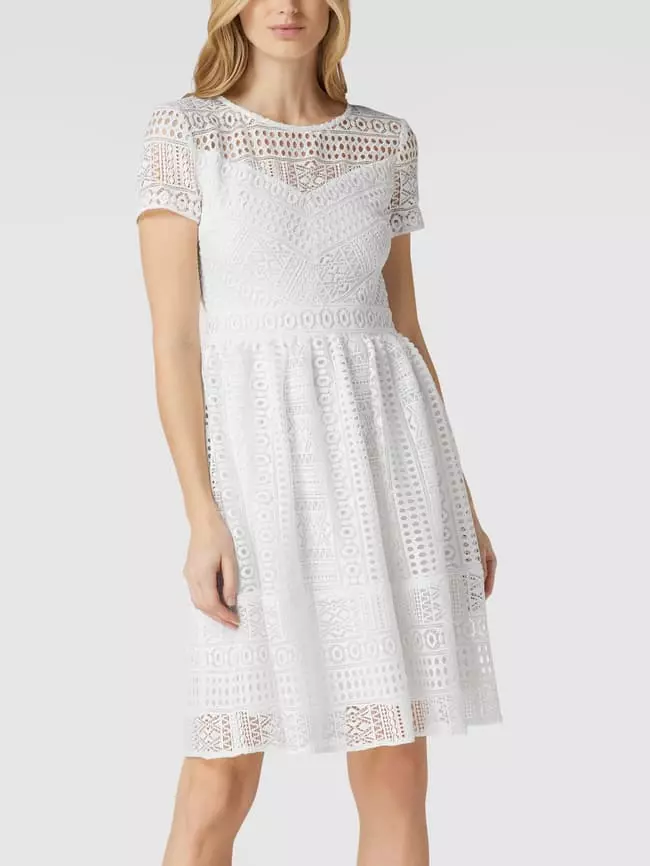 Das Brautkleid von SWING ist aus strapazierfähigem Material gefertigt und tailliert geschnitten. Es kommt mit Lochstickereien, Rundhalsausschnitt und ausgestellter Rockpartie.