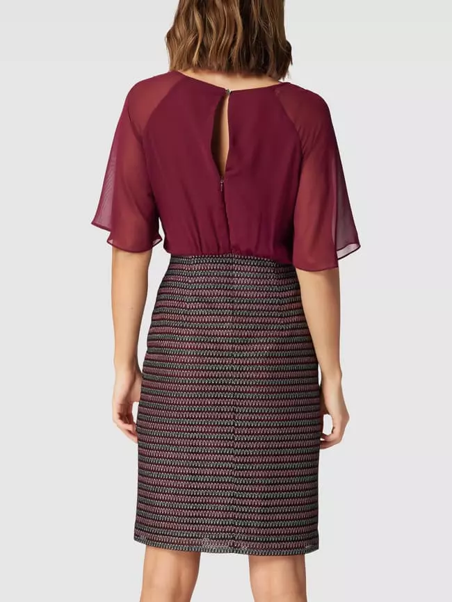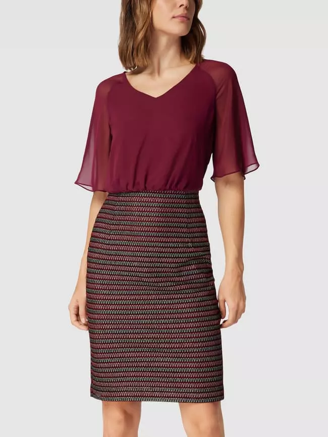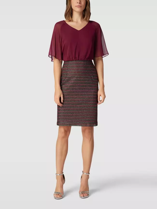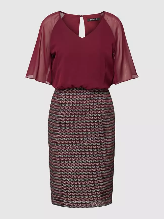 Das Cocktailkleid von SWING ist aus strapazierfähigem Material gefertigt und tailliert geschnitten. Es zeigt sich mit abgerundetem V-Ausschnitt und Effektgarn.