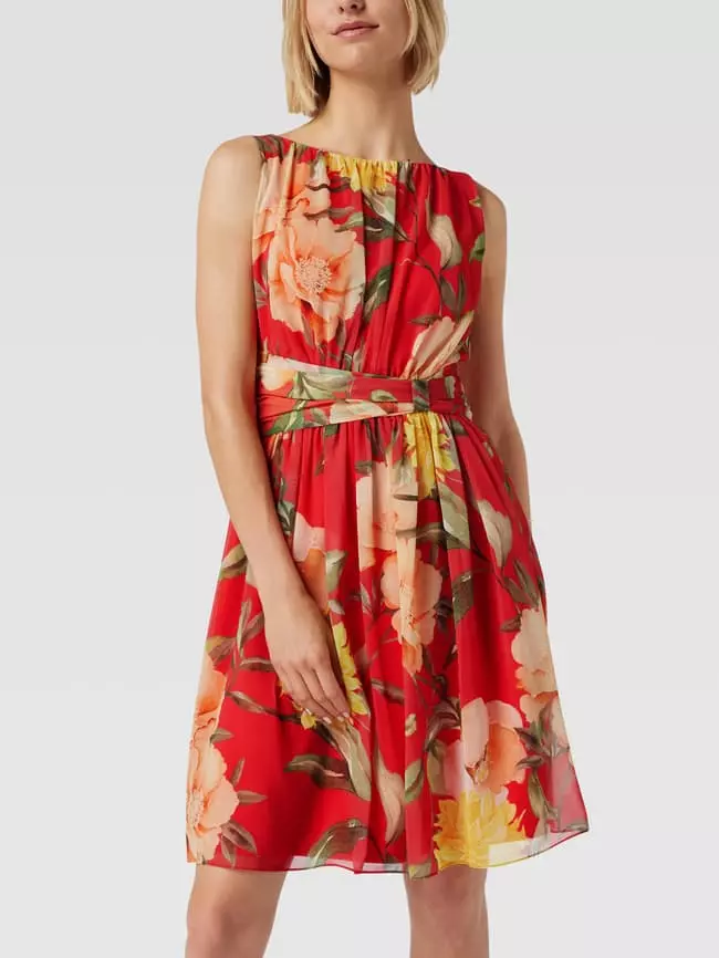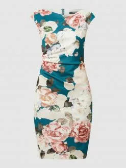 Das Cocktailkleid von SWING ist aus einem strapazierfähigen Material gefertigt und tailliert geschnitten. Es zeigt sich mit floralem Allover-Muster und Rundhalsausschnitt.