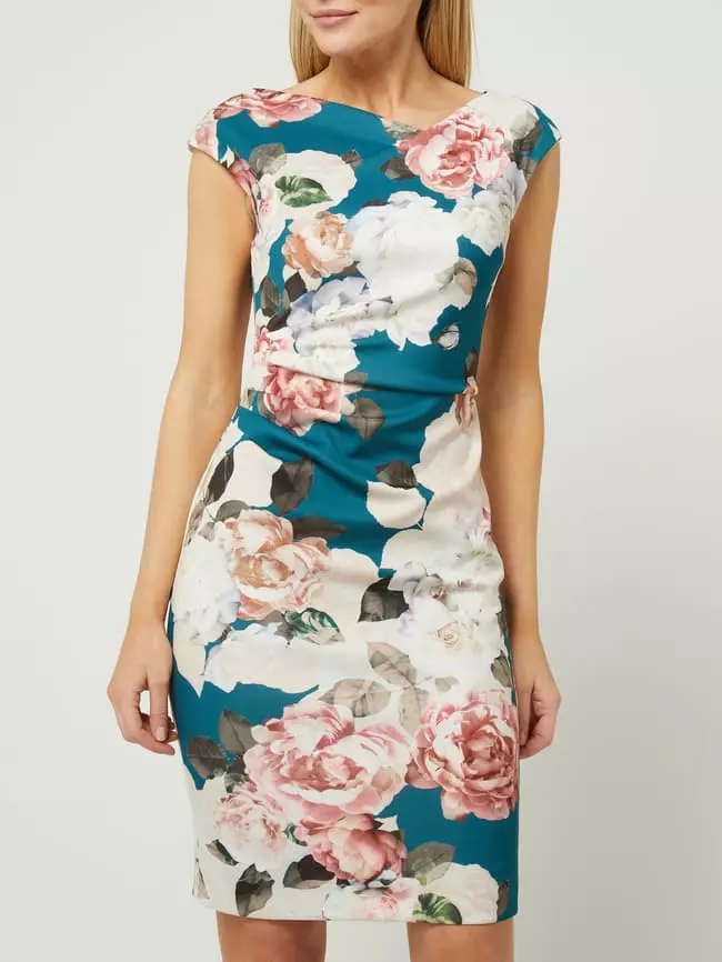 Das Cocktailkleid von SWING ist aus einer Materialmischung mit Stretch-Anteil gefertigt. Es kommt mit floralem Muster, seitlicher Drapierung und kurzem Gehschlitz.