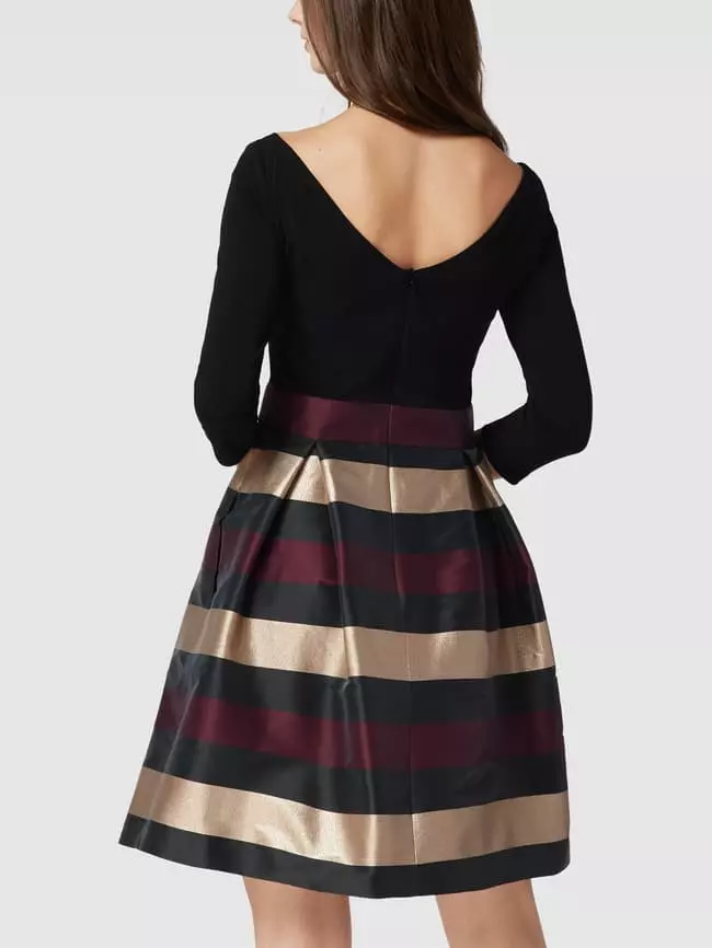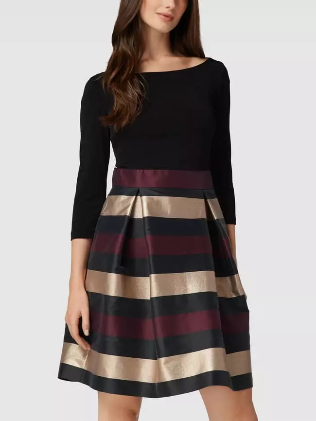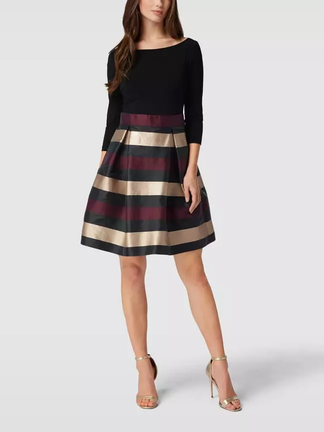 Das Cocktailkleid von SWING ist aus einem strapazierfähigen Material-Mix gefertigt und im taillierten Schnitt gehalten. Es zeigt sich mit Streifenmuster, U-Boot-Ausschnitt sowie 3/4-Ärmel.