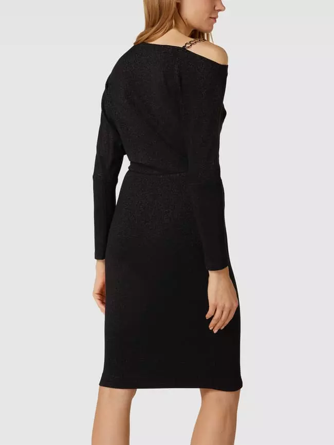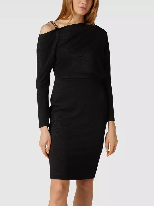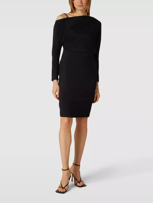 Das knielange Cocktailkleid von SWING ist aus einem Viskose-Mix mit Stretch-Anteil gefertigt und im körpernahen Schnitt gehalten. Es zeigt sich in unifarbenem Design mit Effektgarn und Ketten-Besatz.