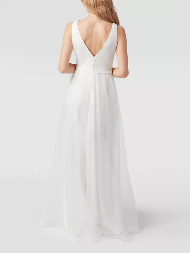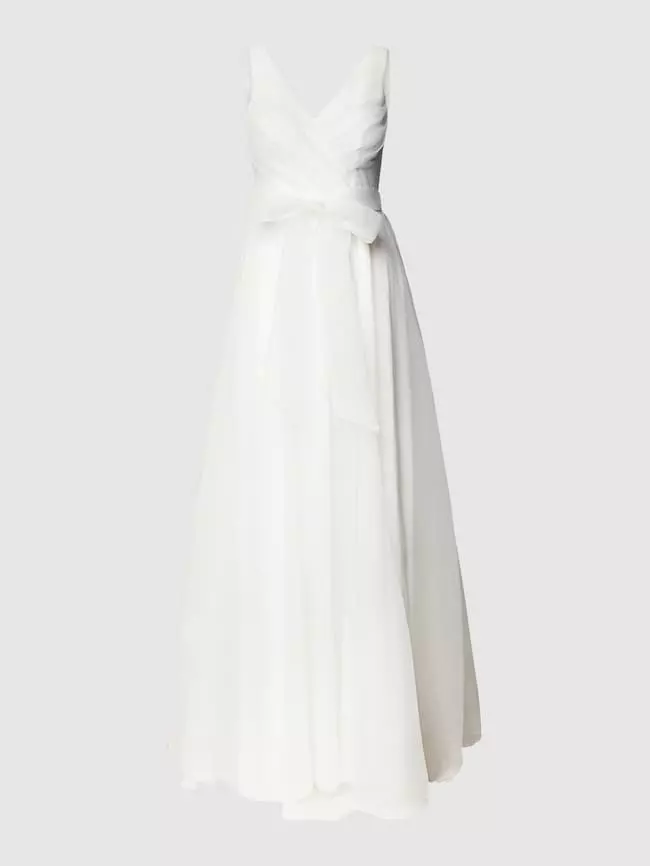 Das Brautkleid von TROYDEN COLLECTION ist aus strapazierfähigem Material gefertigt und tailliert geschnitten. Es kommt mit Taillenband und V-Ausschnitt sowie Oberteil mit Raffungen.