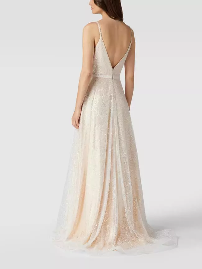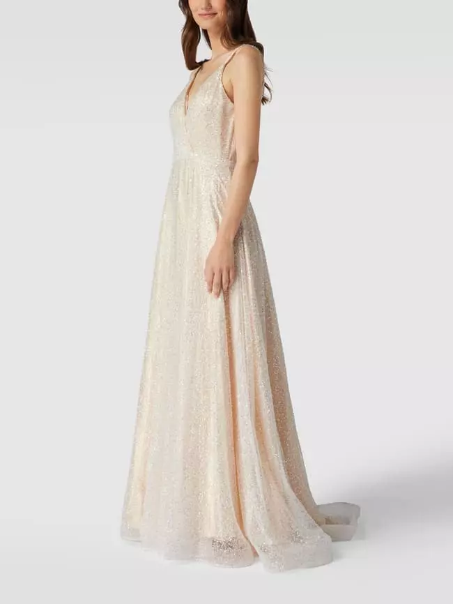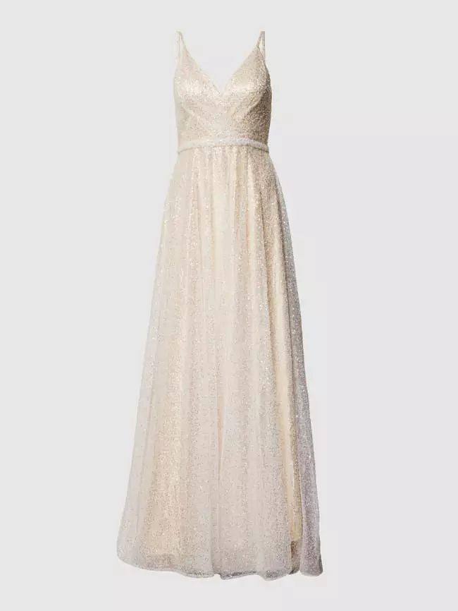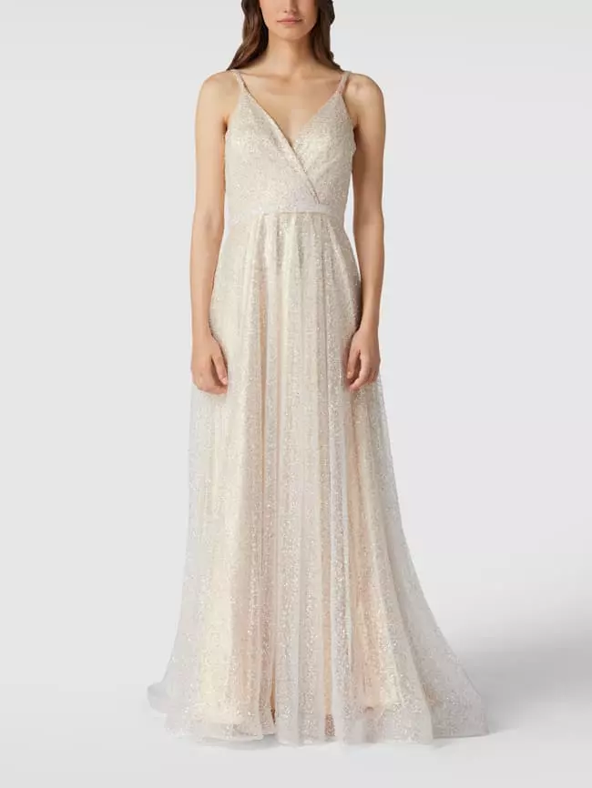 Das Abendkleid von unique ist aus strapazierfähigem Material gefertigt und tailliert geschnitten. Es zeigt sich mit V-Ausschnitt in Wickel-Optik, Allover-Pailletten- und Perlen-Besatz und Spaghettiträgern.