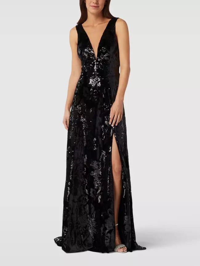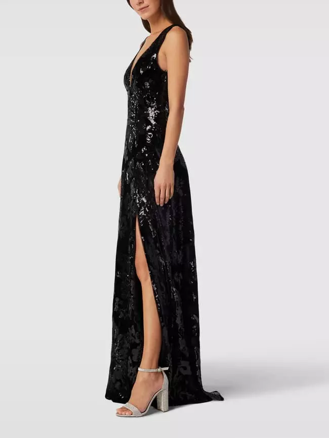 Das Abendkleid von unique ist aus einem strapazierfähigen Material gefertigt und körpernah geschnitten. Es zeigt sich mit Paillettenbesatz und tiefem Gehschlitz.